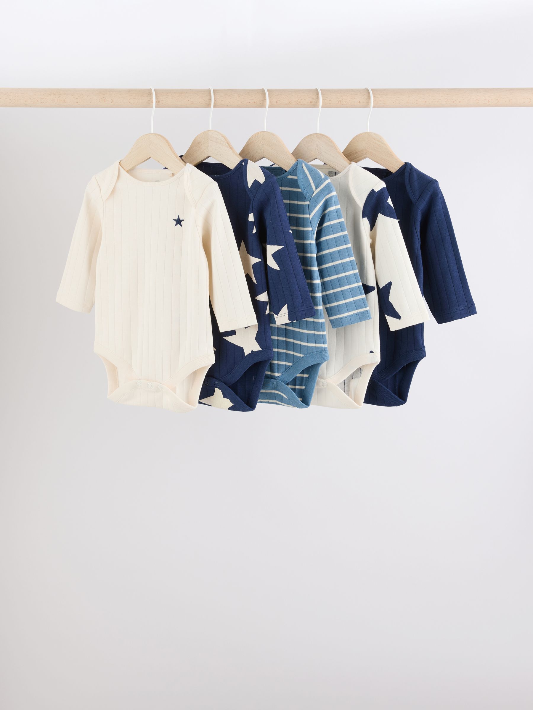 Keep your little one stocked up in comfy staples, with this 5-pack of pure-cotton long sleeve bodysuits, featuring a ribbed textured fabric, popper bottom fastenings for easy dressing and an envelope neck opening. There’s star, striped and plain options in the set for a different look every day.