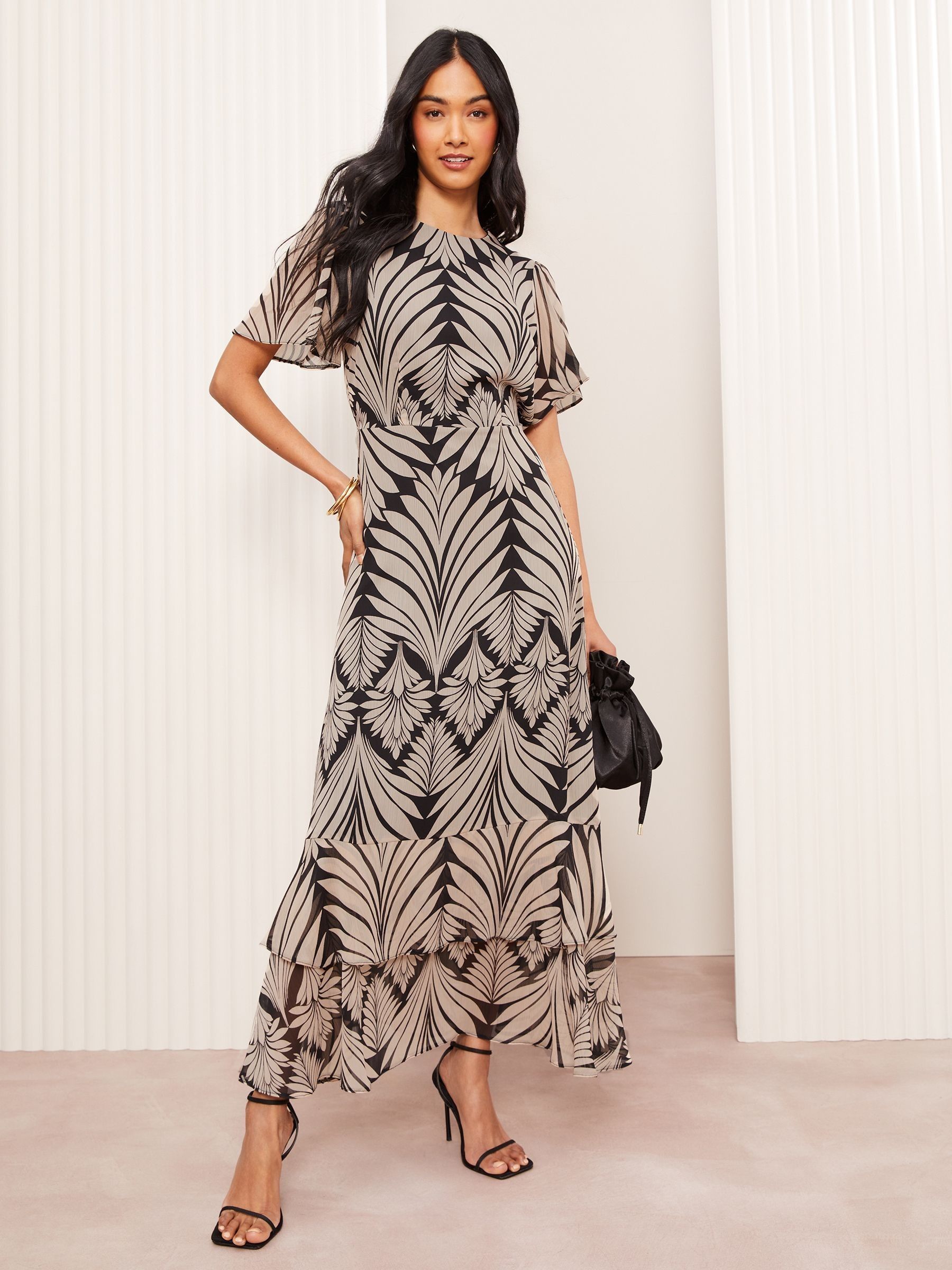 Our beautiful chiffon based, short sleeve printed midi dress features short flutter sleeves, a crew neckline, tiered hem, and midi length; the perfect stylish and flattering piece for any occasion or event! Model height. 5’8.5 Model size. UK 8 Wearing length. 142cm.