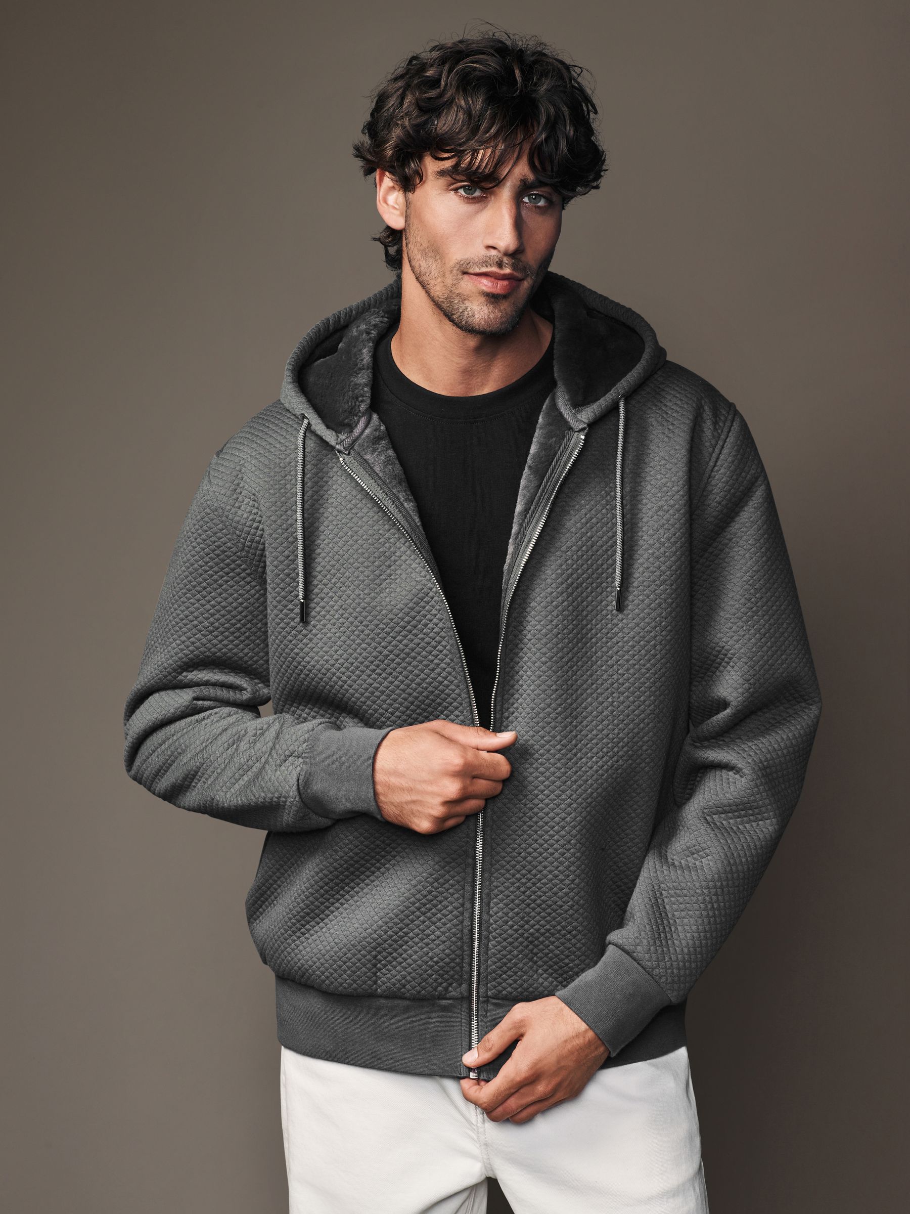 This premium zip-through fleece has a classic casual shape with a diamond stitch textured outer shell, a full-zip fastening and an adjustable hood, alongside an ultra-soft velour fleece lining that extends to the hood, side seam pockets and elasticated hems.