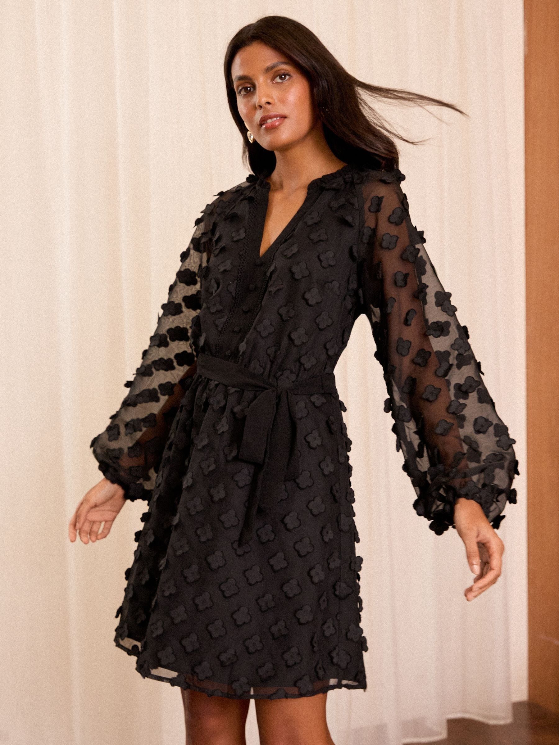 A mini dress featuring a 3D flower fabric and tie waist, model wears size 10. 3D Fabirc. Mini length. Tie Waist.