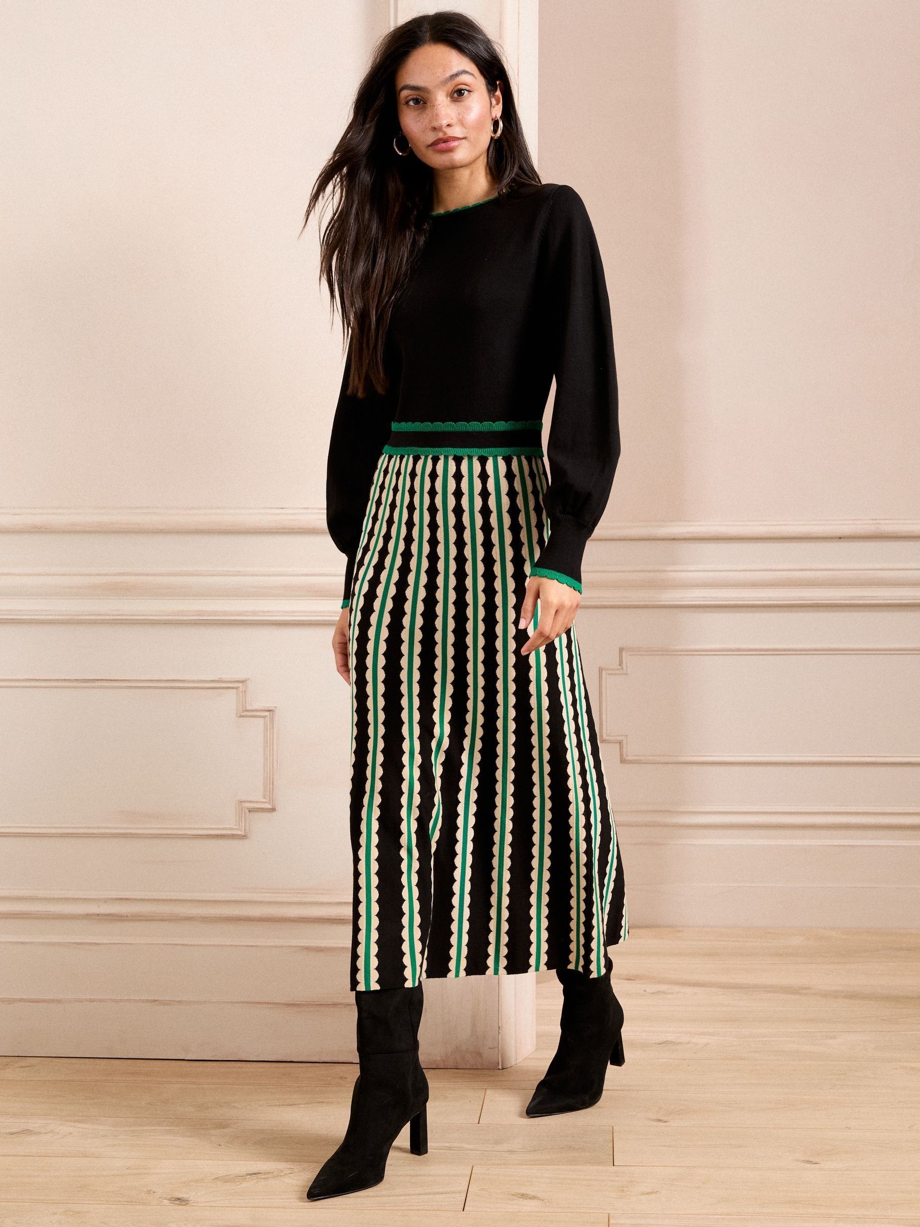 Love & Roses Black Scallop Chevron Long Sleeve Knitted Midi Dress In Stock