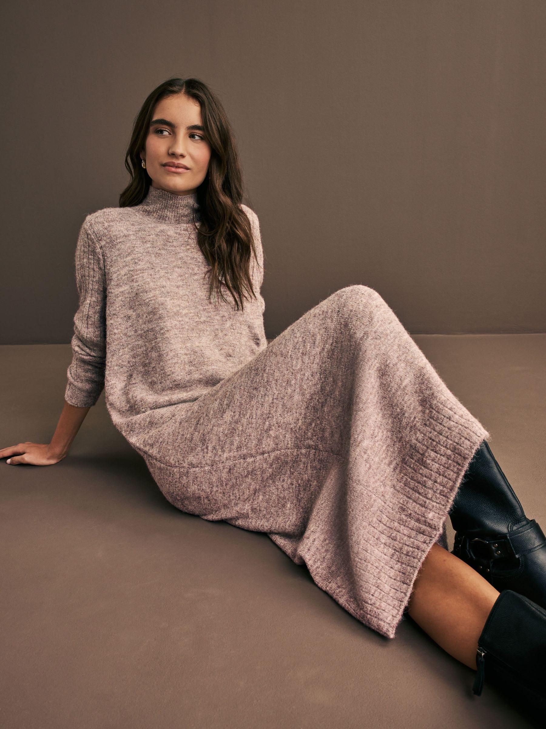 This stylish knitted jumper dress combines a relaxed fit silhouette with a high neck and long sleeves for ultimate comfort and warmth this autumn winter season. Designed with our Signature high quality yarn with a soft touch warm handle, pair this capsule wardrobe essential with chunky boots and a jacket for a smart casual day or with heels for an effortlessly chic and sophisticated office look.